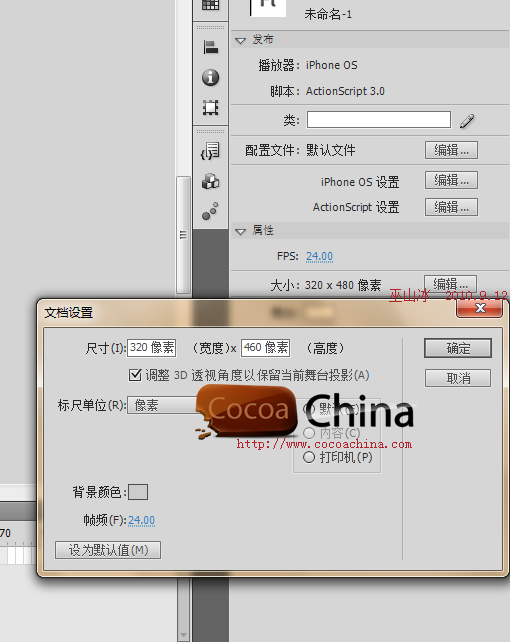 3)根据需要,把文档属性的大小设置成你需要的尺寸大小(之后可以开始制作设计Flash动画),如下图: