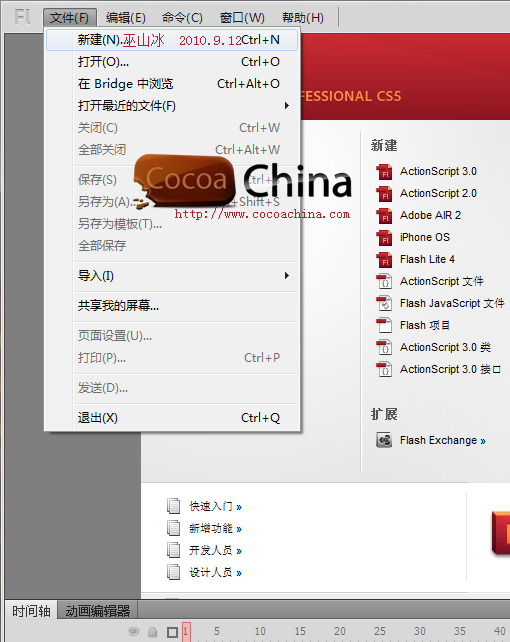 1)打开Flash CS5,点击“文件”菜单,选择“新建”子菜单,如下图: