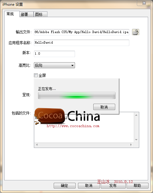 8)点击底下的“发布”按钮,Flash CS5开始为你生成(编译?)相应用程序包,如下图: