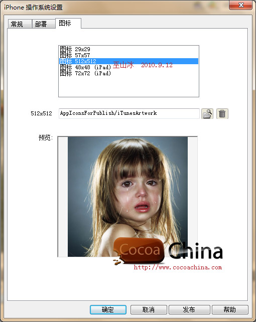 6)在“图标”选项卡中为各种规格图片选择相应的图标文件(好象在XCode中没有提到48x48的尺寸,不知道Adobe公司搞错了没有),如下图: