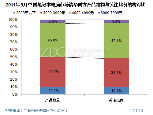 根据ZDC数据统计,用户对于清华同方不同价位段产品的关注比例结构与其产品结构保持整体一致,主流产品累计吸引了85.5%的用户关注。