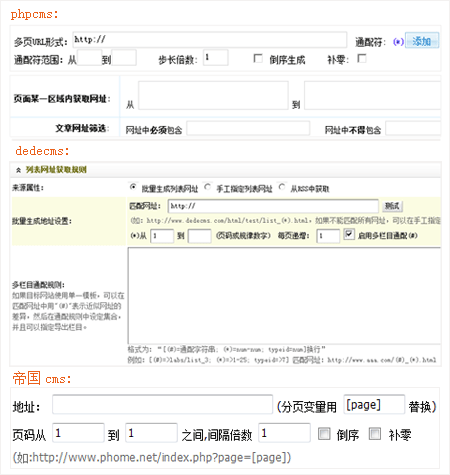 PHPCMS网址采集通过列表页分页通配符实现列表页网址批量添加,然后设置所需采集的网址区域,很多时候,对不熟悉HTML采集规则查找技巧的朋友可以通过直接设置“网址中必须包含”和“网址中不得包含”这两项来实现内容页网址的采集。DEDECMS也用*作分页通配符,不过DEDE中的优点在于可以启用多栏目通配规则,针对不同的栏目页批量设置采集规则,这样可以方便对有相同URL规则的多个栏目同时采集。帝国中则也只是一般的以为通配符的多分页获取,相对表现平平。