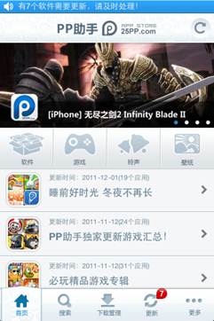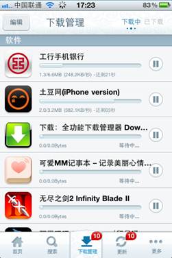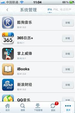 下载管理功能方便:可暂停、继传、删除,最重要的是当您想切换到别的应用软件或游戏的时候,它也能在后台默默地做着下载的工作。支持PXL老格式软件的直接升级为新版的IPA,删除管理。这一点PP助手是非常贴心的,已经考虑到了PXL老格式软件。