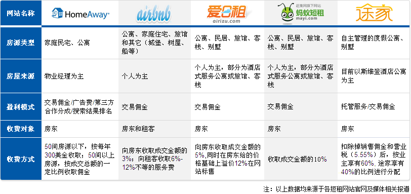 运营模式:从房源类型,房屋来源,盈利模式,收费对象,收费方式进行比较。