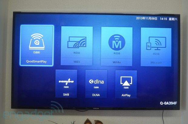 在无线连接上,它支持多达 7 种设备无线互联传输协议,有比较常见的 DLNA、Miracast、AirPlay,还有较少见的 WiDi、WiMo 、Mirrorop,甚至还有 QvodSmartPlay;这就意味着,你手上的智能设备都能和它实现无线匹配。