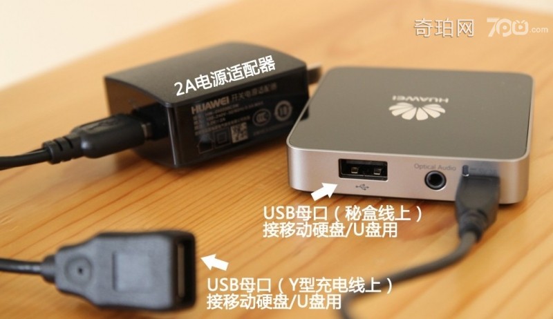 连接移动存储设备、无线键鼠等配件时,我们将USB接入秘盒机身或者Y型充电线材上的标准USB接口均可传输数据,相当于秘盒可以同时连接两个USB设备,而且无需OTG线辅助。小Tip:Y型线上的USB接口具有独立供电,移动硬盘等对供电需求较高的设备接在这里更为合理。