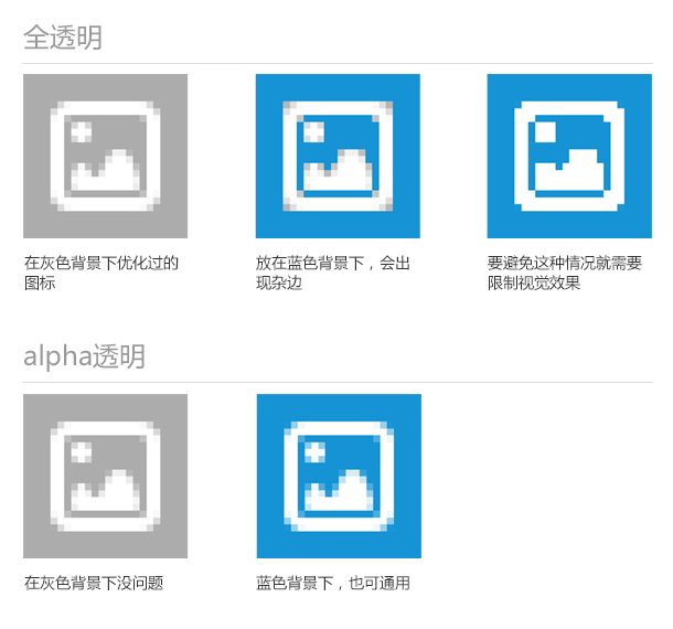 这样看来,用支持Alpha透明的PNG-24才是王道呀。可惜,在ie6下,PNG-24的Alpha透明需要ie特有的css滤镜配合才能实现,所以如果你的产品有很多ie6用户,在做图标前,先跟前端沟通。