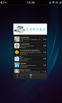 第三方应用要是转制的话,就不要有过高要求了。相对慢是肯定的,你会经常碰到容易卡死的应用,有点小毛病是正常的,偶尔看到 QQ 斗地主这样奇葩分辨率的应用你也不要惊讶;安装后无法打开就重启下手机把;提醒升级?那就当没看见。不知道为什么,无论是转制的还是原生的,中文应用在 APP World 上大多是用英文名,要下载,你得上论坛找,记了英文名后在用手机搜或者扫射二维码。