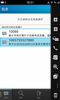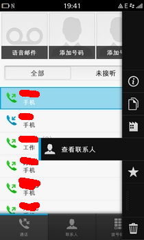 通话记录里面,你看不到已存联系人的号码,遇到一个人有多个号码,直接点击就拨打出去了,要选好其中一个再拨号,你先得长按该联系人,出来的图标你要猜测它是什么意思,要么得上下拖动查看。要想熟练使用这个系统,光内置程序你就要记住好几十个图标。