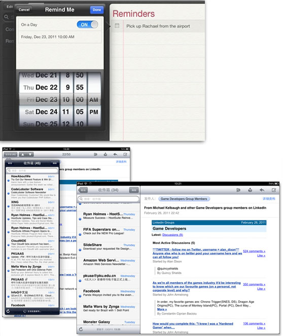 最经典的案例莫过于系统日历、备忘录、Evernote和Mobile RSSS的例子。通过页面分割和浮动窗口,用户可以在一个页面内完成多封邮件或文章的操作。