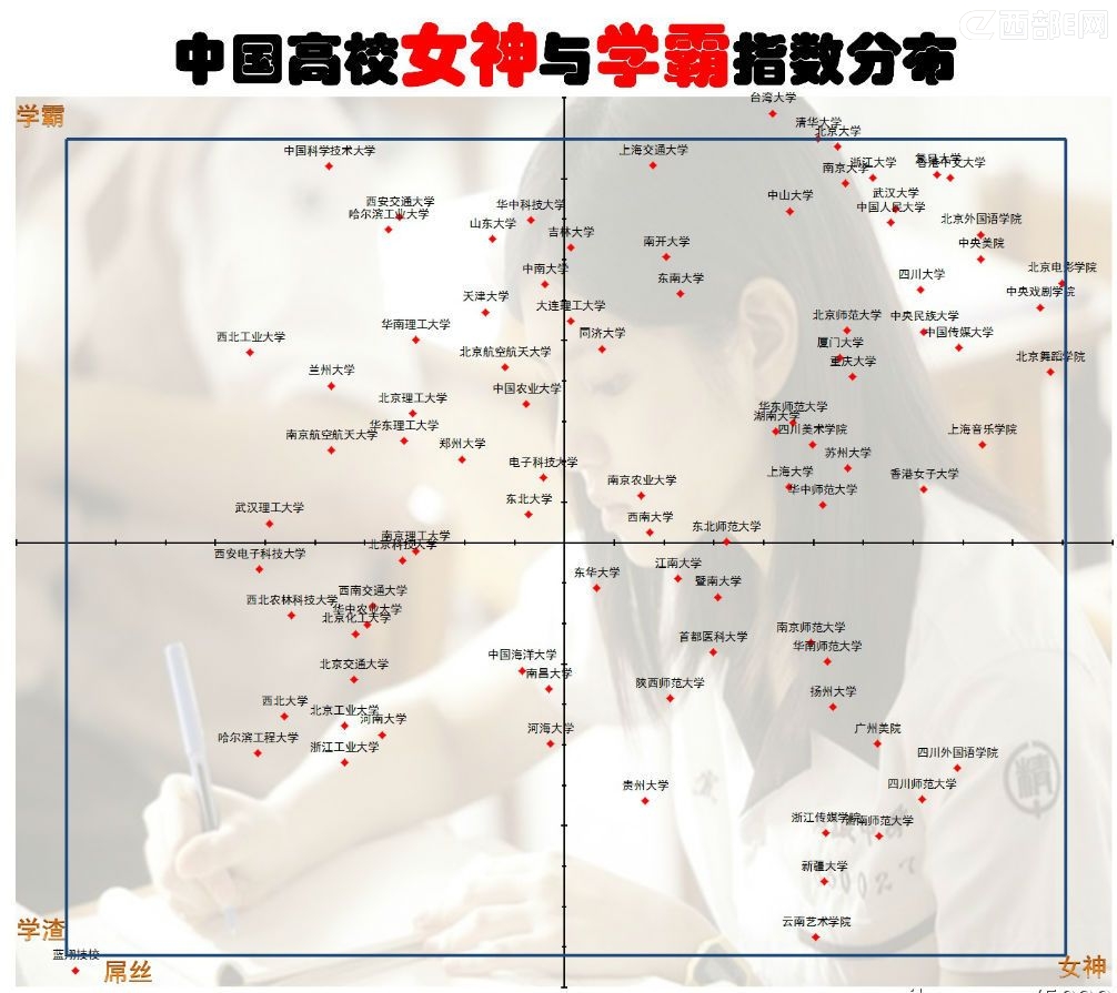 在这份《中国高校女神与学霸指数分布》排行榜中,汇集了内地和港台地区的近百所高校,纵向坐标轴以“学渣”为原点,距离顶端越近,盛产学霸的学风越浓,而横向坐标轴以“屌丝”为起点,延展到坐标轴的顶端意味着有诞生“女神”之风。