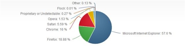 来自Net Applications的统计则与StatCounter有较大出入,虽然Chrome、IE、Firefox是最受欢迎的三大浏览器,但地位却截然不同。IE才是浏览器霸主,市场份额为57.6%;Firefox位居第二,市场份额为18.88%;Chrome则是第三,市场份额为16%。