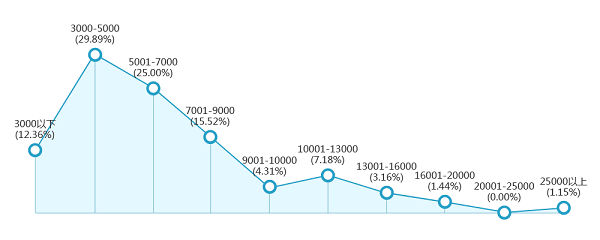 - 开发者薪资水平月薪范围普遍在5000左右,3000以下占12.95%,7000~9000占14.76%;