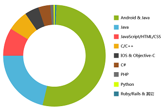 - 开发者工作中使用和学习频率最高四种编程语言是:Android&Java、IOS&Objective-C、Java、JavaScript/HTML/CSS.