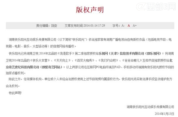 乐视网法务部门有关负责人表示,之所以在诉讼中同时提交停止侵权的禁令申请,是因为乐视网投入巨资,才获得《我是歌手》第二季独家网络授权;非法侵权行为的泛滥,每时每刻都在扩大造成的损失。近日,依法独家享有湖南广播电视台自有版权作品(包括电视节目、电视剧、电影、音乐、大型活动等)的信息网络传播权的湖南快乐阳光互动娱乐传媒有限公司,也在湖南卫视官网金鹰网上再次声明(http://corp.hunantv.com/a/20140114/1731013128.html),已将《我是歌手》第二季独家授权给乐视网,包括在互联网PC电脑终端及PAD、手机移动终端上的独家点播权利;任何其他媒体机构、单位或个人,未经合法授权使用节目视频,均属侵权行为。