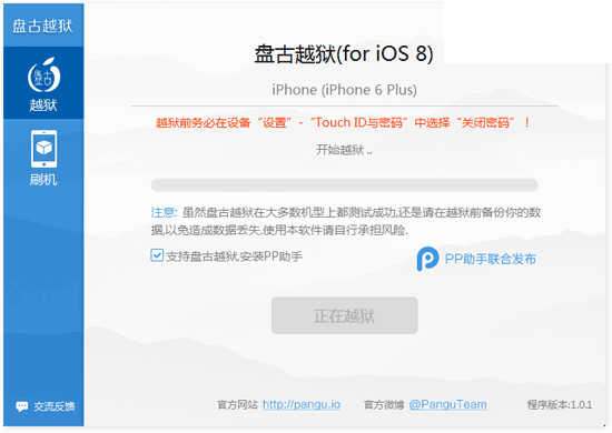 盘古越狱 for iOS8发布了,支持iOS8.0-iOS8.1.x,设备支持能够安装iOS8的iPhone、iPad和iPod Touch设备。越狱操作简单,几乎就是一键式越狱。