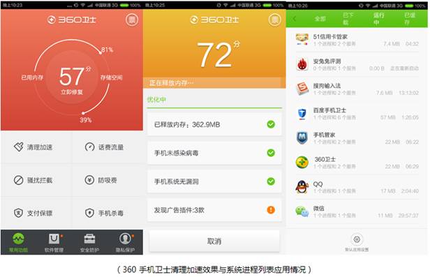 另一款产品360手机卫士的表现则令人失望。清理加速功能优化后,数据上显示已释放内存362.9MB,系统得分由57分升到了72分,但系统进程列表却显示优化前手机中开启的所有应用仍然存在系统内存列表中,也就是说这些软件仍然占据手机内存,并没有真正做到降低CPU使用率和内存占有率。