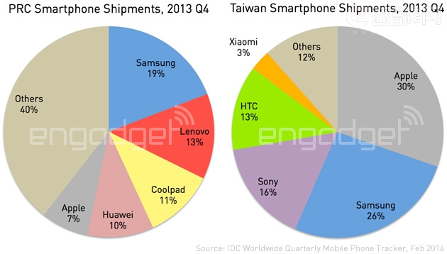 而在台湾地区的智能手机销量排行就大不相同了,排在前几位的品牌有: