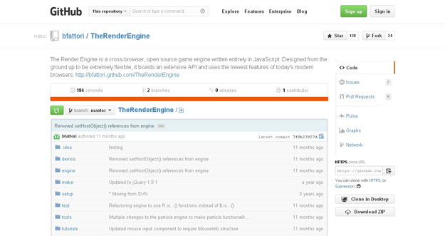 The Render Engine 是个跨浏览器的,开源游戏引擎,完全使用 JavaScript 编写。它拥有一个扩展的 API 和使用当前最新的现代浏览器特性。此款引擎旨在帮助用户使用基础的工具来开发游戏,加快游戏概念到成品的过程。