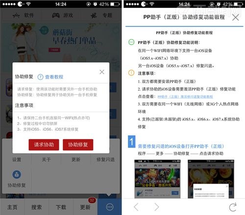 PP助手正版具有独特的协助/请求修复功能。在同一个Wi-Fi网络环境下,支持一台iOS设备协助另一台iOS设备修复闪退,功能中还附有详细的图文教程,操作简单迅速上手。