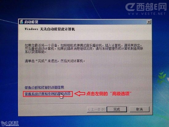 开机系统自动修复完成后,在“启动修复”界面点击“查看系统欢迎和支持的高级选项”