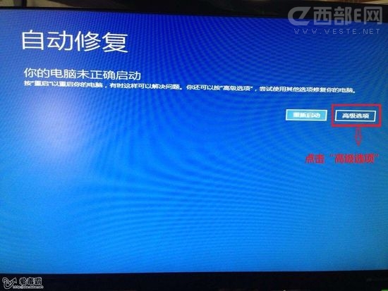 在系统自动修复完后显示”你的电脑未正确启动“时,点击“高级选项”