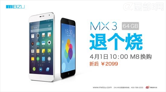 1、2014年4月1日10:00起,登陆新浪微博“退个烧,小米也能换魅族”换购页面(@魅族科技 ),输入所持旧手机型号或魅族M8型号,即可以 2099元的价格购买原价2599元的魅族MX3 64G一部(用户先付全款2599元,付款成功后,魅族公司即时发货并附一张金额为2099元的发票);