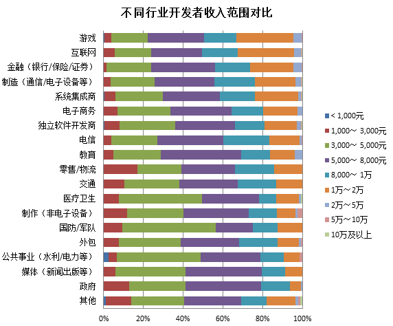 该调查结果也与大趋势相符,无论是PC时代还是移动时代,游戏一直都是最盈利能力最强的行业,相应高收入者也会偏多,而金融开发者的收入也因为近年来金融IT产品发展的多样化而逐渐增多。