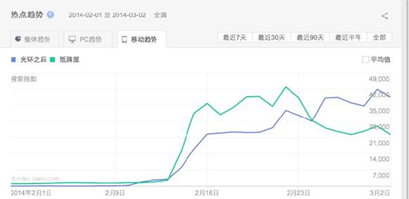 图示二百度指数《光环之后》与《纸牌屋》移动趋势对比(2014.2.1-2014.3.2)