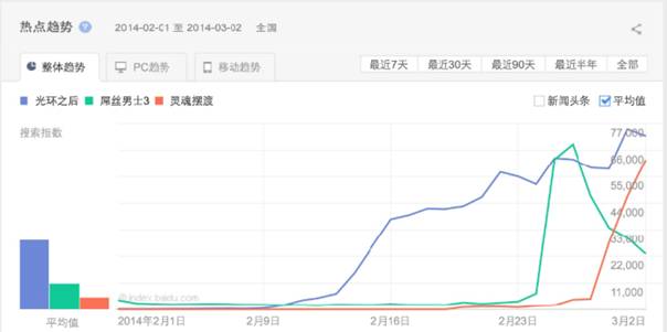 图示三百度指数《光环之后》《屌丝男士3》《灵魂摆渡》整体趋势对比(2014.2.1-2014.3.2)