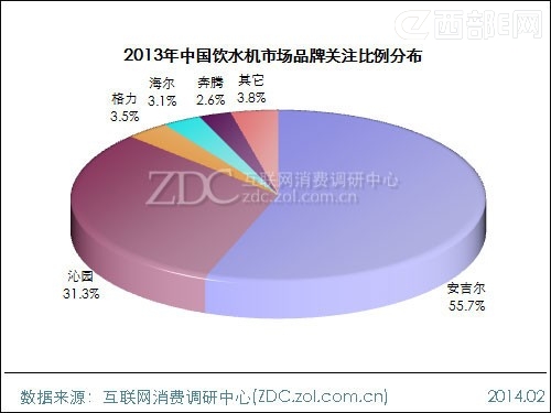 下面我们来看看ZDC发布的2013年中国饮水机市场品牌关注排行: