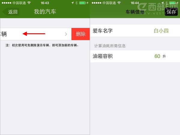 5、在“我的汽车”界面可以看到一个“演示车辆”,用手向左滑动,就可以删除这个演示车辆。删除后,APP会提示让您输入新的汽车名字和邮箱容积,这个根据您爱车的实际情况进行填写。