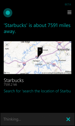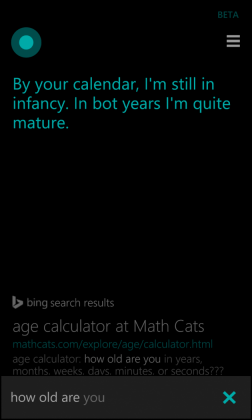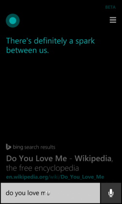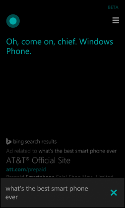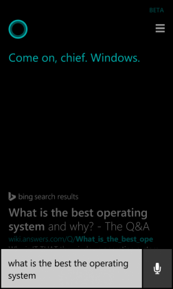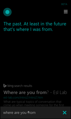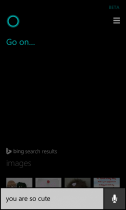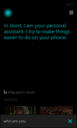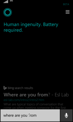 18、cortana也包含了bing搜索服务,在这里需要说明的是:在定位关闭的情况下,单击搜索键是bing,长按搜索键是tellme(就是WP8上的那个语音助手),而打开定位,cortana才会开启,单击是打开cortana,默认文本输入模式,长按是默认语音输入模式。可以说Cortana对bing还有系统的整合都是很不错的,cortana也继承了tellme的一些特性,比如语音控制第三方应用,也可以用bing搜索你想要获取的内容。