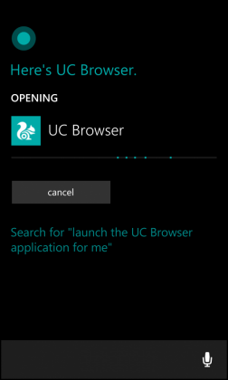 说:“launch the UC application for me,please.”——“请帮我启动UC。” 都是简单的启动一些应用,不过不能识别中文,比如QQ、QQ音乐、QQ空间在cortana眼里都是QQ,她无法识别哪是哪。