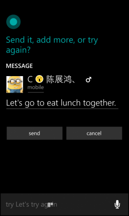 联系人是英语才能识别出来,我这里是给联系人设置了人物关系,给联系人设置了别名,我设置的是英文名“Mike”便于cortana识别。随后即可说“yes”或者“no”来确认是否电话打出去。#p#分页标题#e#