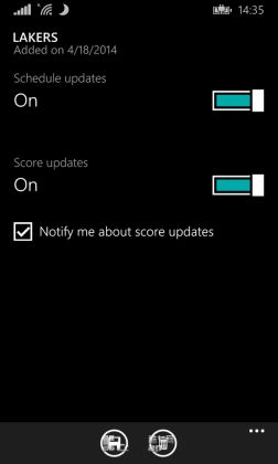 (5)体育:进入该项目中,用户可以选择自己感兴趣的队伍,比如我这里输入了“lakers”,就可以订阅到有关于湖人队的赛事信息。在体育的设置界面中,包含了“更新比赛进展”和“更新比分”的开关,同时cortana还可以在比分更新的时候提醒用户,该功能同样可自行关闭。