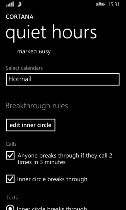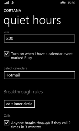 除此勿扰时段中还提供了“Breakthrough rules”选项,意思就是可以设置在勿扰时段可以破例的联系人,有关破例的联系人的电话,邮件,消息可以在勿扰时段继续提醒的到用户。