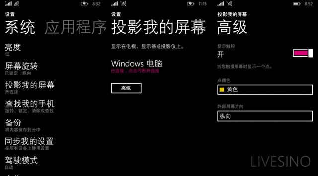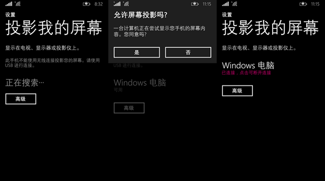Windows Phone 8.1 新功能投影我的屏幕(Project My Screen)可以将手机画面实时投影到电视、电脑等设备方便 WP8.1 真机演示。通过 Miracast 无线或 USB 有线都可以使用,前者需要硬件/硬件固件和接收端支持,后者需要在电脑上安装驱动和程序。