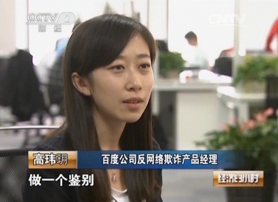 百度公司反网络欺诈产品经理高玮玥在节目中向观众演示了如何识别或鉴定诈骗网站。“对于常见的仿真网站,一般只有比较专业的用户才能辨别,而对于网上有诱惑力的信息用户最好先做一个鉴别,看一下它是不是真的可信,然后对它的地址URL也做一个检测,看一下是不是真的。这个可能对于一些年轻的、比较专业的用户才可以做到,那么就广大网民来说,建议大家安装正规厂家的安全产品。”