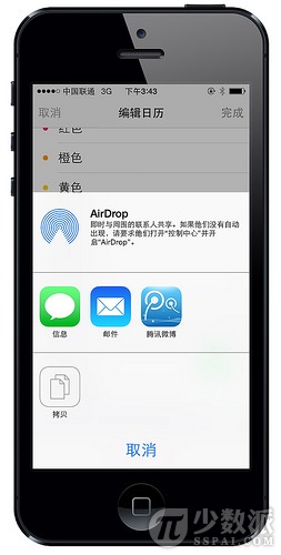 - 可以选择通过 AirDrop、信息、邮件和微博的方式直接分享,也可以选择「拷贝」当前日历链接,将其发给某人或发布到某处,接收者可通过点击链接直接订阅该日历(课程表)。