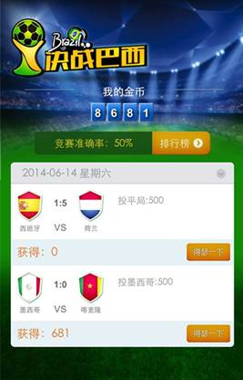 另外,据游戏页面资料显示,用户只要分享自己的比赛投注情况就有机会得到5元余额宝红包。世界杯结束后,在银河系排行榜上金币总数位列前2014名的用户可以获得由支付宝提供的总价超40万元的红包,前20名分别可得到4999元巴西旅游基金大奖。