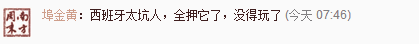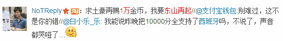 不少球迷在微博哭诉,自己把支付宝钱包送的1万金币全投给了西班牙,结果惨不忍睹,甚至还有球迷请求支付宝再支持自己1万金币东山再起。