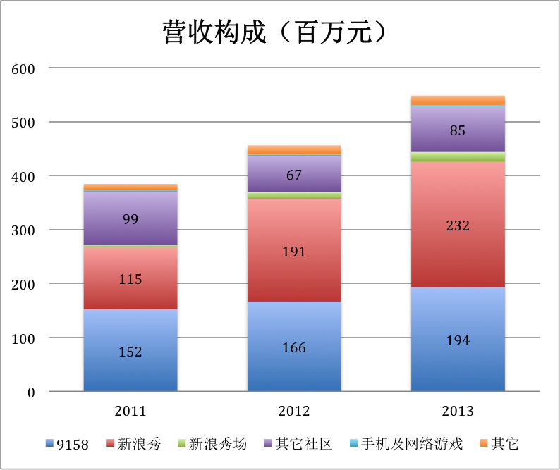 2011年、2012年、2013年,不算新浪带来的业务,9158加“其它社区”营收合计分别为2.51亿、2.33亿和2.79亿,与传说中的10亿元相差甚远且增长乏力。