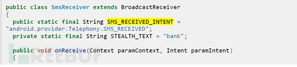 第3个class包含的事件比较多。onBoot在启动的时候就会进行闹铃,SmsReceiver和alarmReceiver则是真正的木马,在任何一个短信到达的时候SmsReceiver会检查里面是否包含有”bank”,如果是则使用abortBroadcast丢弃短信。