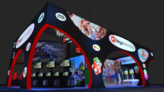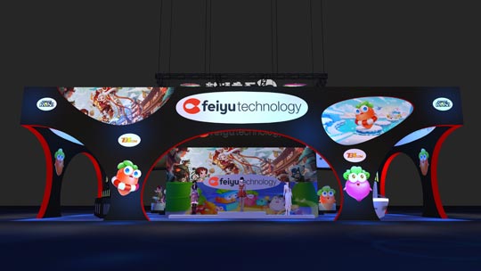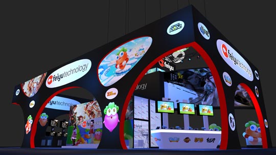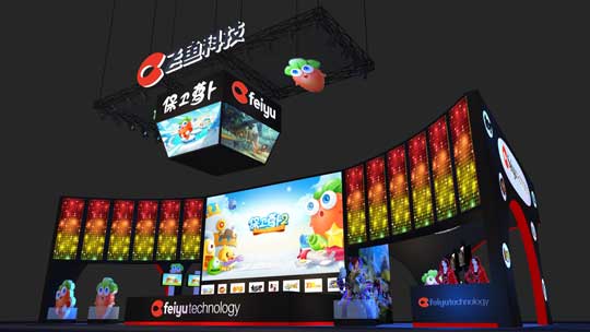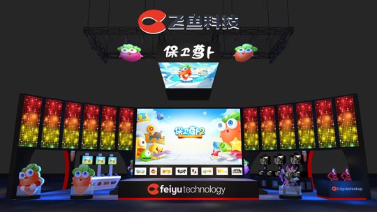 从效果图上看,展台内部结构层次分明,将页游、手游及今年的神秘新作一一呈现在玩家面前,使玩家能够从更全面的角度了解飞鱼科技的文化精髓和游戏乐趣。同时,展台设计注重细节上的处理,大量《神仙道》游戏元素的应用将唤起玩家的仙侠情结,《保卫萝卜》的可爱造型更是令展台瞬间“萌化”,独特的设计将带给玩家不一样的乐趣。同时,展台上方的巨大LED屏还将通过视频的方式向玩家全方位展示飞鱼科技旗下的多款产品。