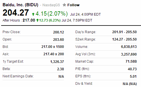 今天凌晨,百度发布了截至6月30日的2014财年第二季度未经审计财报。报告显示,百度第二季度总营收为人民币119.86亿元(约合19.32亿美元),同比增长58.5%;第二季度净利润为人民币35.47亿元(约合5.717亿美元),同比增长34.1%。百度第二季度业绩超出华尔街分析师预期,推动百度股价在纳斯达克常规交易中上涨4.15美元,报收于204.27美元,涨幅为2.07%。在随后截至美国东部时间16:56(北京时间4:56)为止的盘后交易中,百度股价再度上涨14.19美元,至218.46美元,涨幅近7%。目前公司市值已达到714.54亿美元。