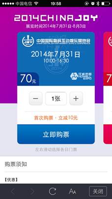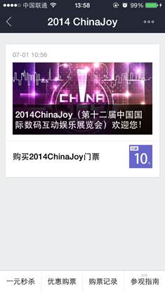2014 ChinaJoy将在7月31日正式开展。本届展会中,ChinaJoy力推手机购票,而支付宝钱包则成为ChinaJoy官方唯一的电子票销售渠道。为了方便用户购票,ChinaJoy入驻了支付宝钱包的服务窗平台,支付宝用户在“2014ChinaJoy”的服务窗中就可以随时随地购买电子门票。
