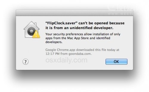你可能已经注意到 在 Mavericks 和 Yosemite 中,安装屏保已经不再向从前一样双击就可以完成了.你将会看到以下的警告信息,关于开发者未知程序是否被信任等信息: