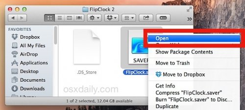 1, 从 Finder 的窗口中 右键单击 "Filename.saver" 并选择 "Opne"