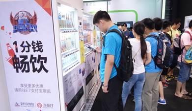 图注:ChinaJoy现场,用户在售货机前用支付宝钱包抢购一分钱饮料